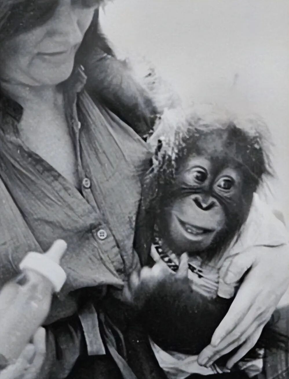 邻居们常常会看到这样一幅让人忍俊不禁的画面:妈妈推着婴儿车,里面坐着一只叼着奶瓶、穿着纸尿裤的猩猩。