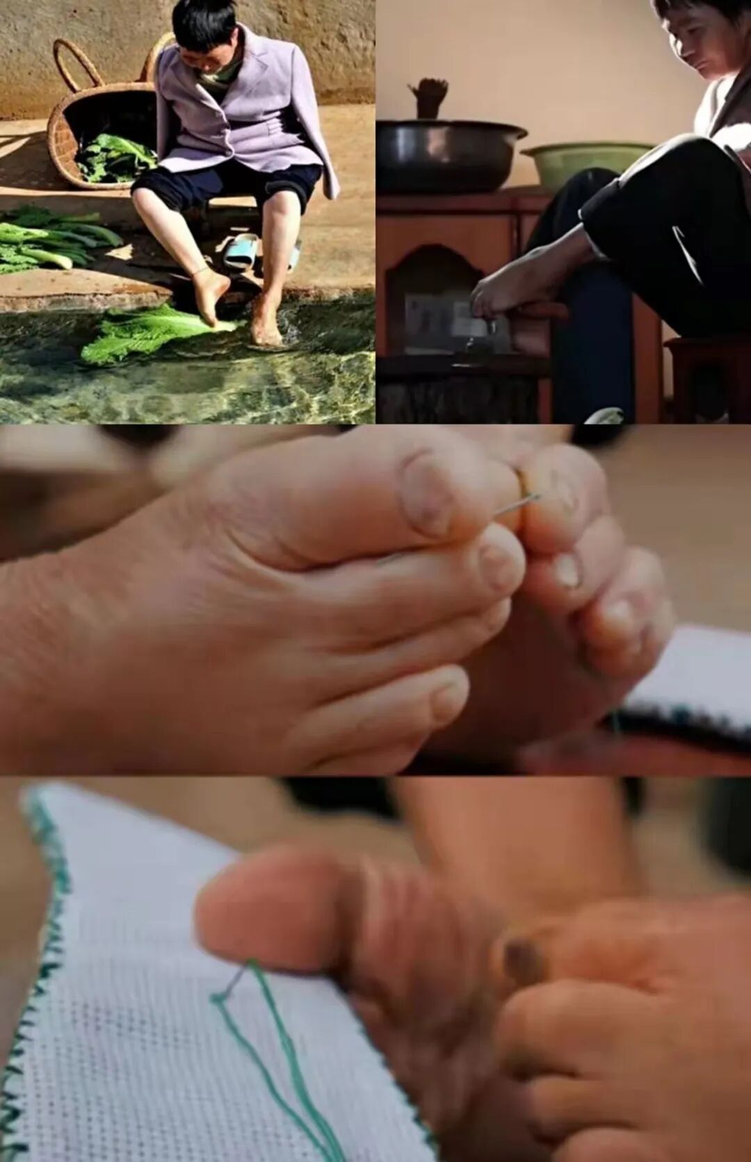 为了减轻丈夫的负担,嫁人前从未下过厨的李国秀百般练习,愣是学会了用脚洗菜、切菜、炒菜,后来更是练出“双足绣花”的本领,还能用刺绣作品挣些钱。