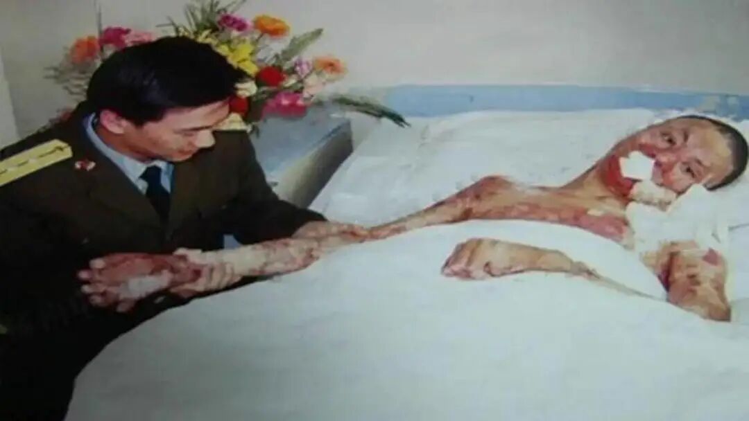 然而,到傍晚时,风向却突然转换,只见火势直接蔓延到了隔离带。在这危急时刻,葛新峰连忙拿起铁锹拼命灭火,可偏偏这时候,又出了状况。由于长时间的奋战,葛新峰体力不支,结果不小心一脚踩空,直挺挺地滚下山坡,跌入了火海中!连长见状,急忙大声呼喊:“快救人快救人!”紧接着他自己也滚下山坡,想把葛新峰救出来。可不料,他的头部却撞到石头上,顿时昏迷过去。其他战友看到这一幕,纷纷跳下去救连长和葛新峰,万幸的是,两人都被救了上来。但令人痛心的是,两人已被烧得血肉模糊……最终,山中的大火被扑灭了,但葛新峰和连长却命悬一线,经过十几次手术,才将他们从鬼门关抢回来。救火的任务完成了,山顶的部队仓库以及百姓的生命财产也都保住了,葛新峰也因此荣获一等功。而这一等功的背后,却是惨痛的代价,葛新峰全身烧伤面积高达72%,他的十根手指末端都被截,左臂脱臼无法复原,脸部更是被烧得毁容,成了二级伤残。