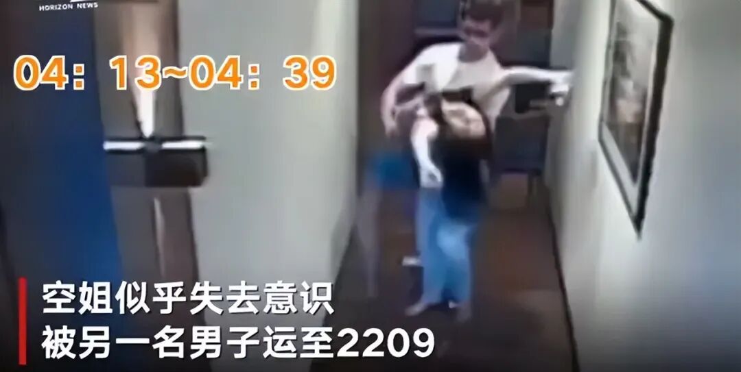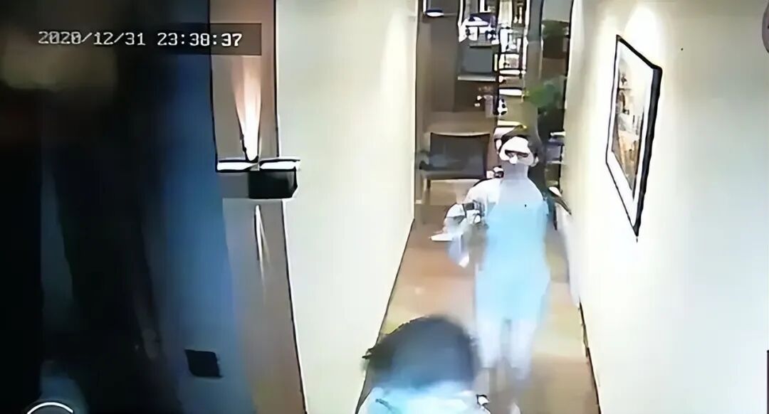其中一个男子直接抱着克里斯汀出现在走廊里,这时,克里斯汀整个身体下垂,完全是昏睡的状态,因为即便男子搬运她,也并没有醒来。