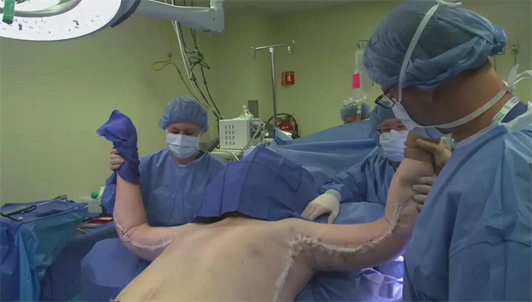 专家和她的团队经过反复推敲,为保罗量身打造手术方案,这台手术历经9个小时,医生从保罗身上切下重达60多斤的皮肤,光缝合线就用了1000多根。