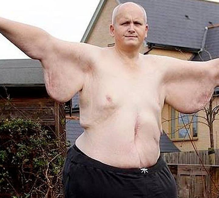 减肥后的保罗,浑身的皮肤开始松弛下垂,双臂张开后犹如蝙蝠侠一般。