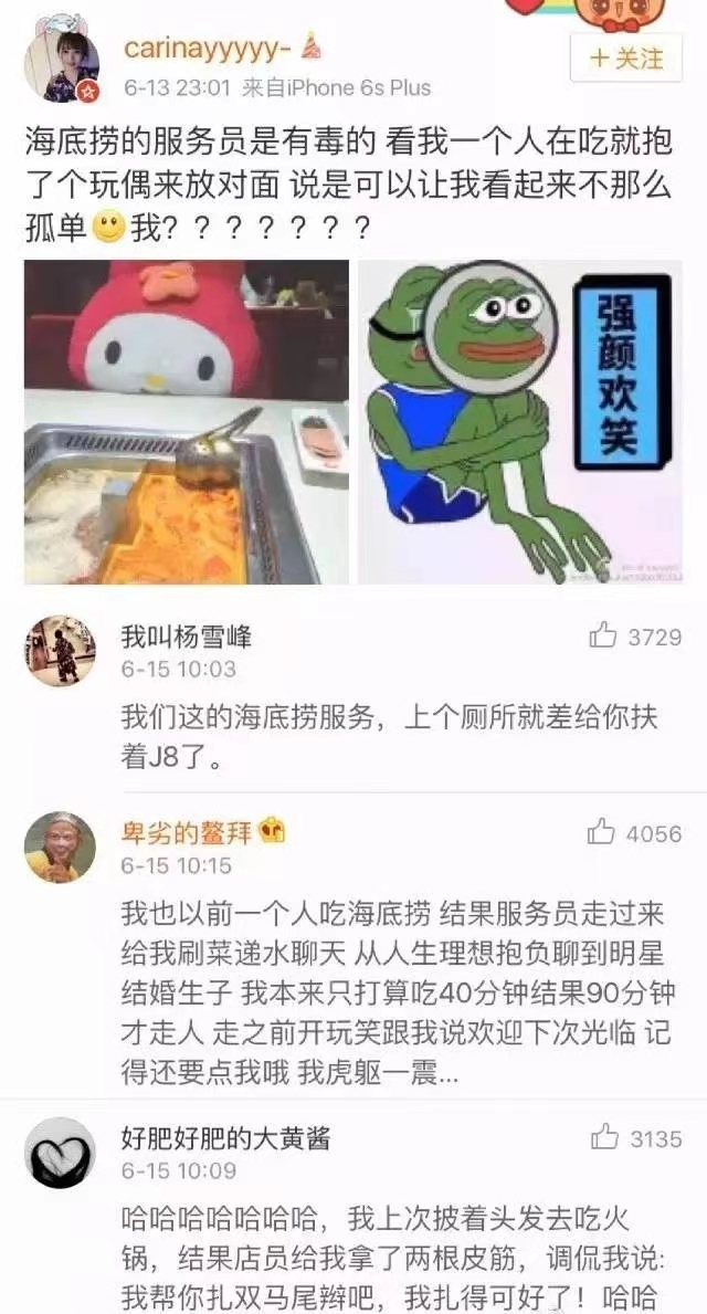 但是在海底捞,店员是不会允许你一个人吃火锅的,即使你的对面是一只毛绒玩具,那也能让你稍稍排解一丝孤独感。