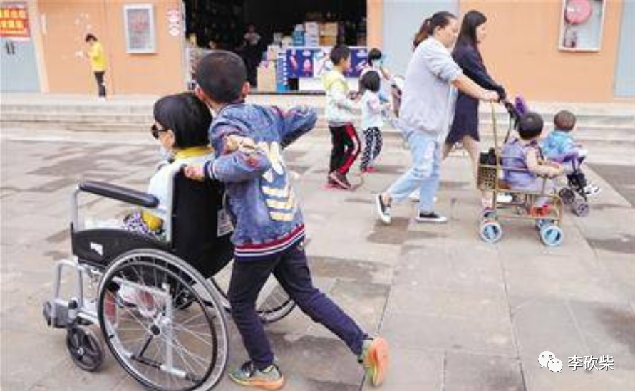曾经有一张照片在网上刷屏:一个瘦弱的小男孩用力地推着轮椅上的一个成人,和身边躺在婴儿车里被妈妈推着的孩子擦身而过。