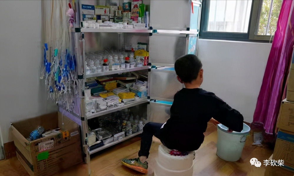 他拿出妈妈的口服药和输液瓶,熟练地注入药液,为妈妈埋针、挂上点滴,再喂她吃下药片。然后回到自己的桌子前开始写作业。