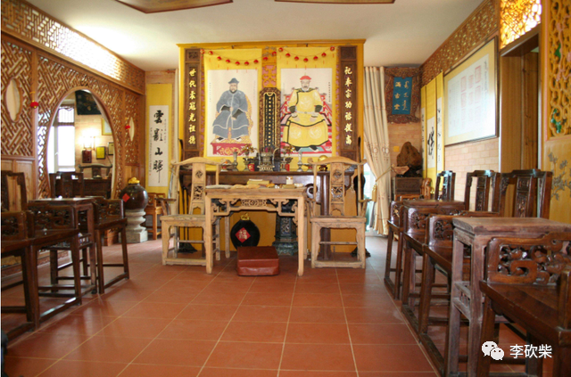 在某个房间里,还挂上了两幅古人的画像,旁边有8面各色的大旗,画像下面有两个牌位,牌位上分别写着“先祖努尔哈赤之位”、“先祖多尔衮之位”。