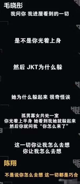 2017年的10月1日晚上9点,提前结束了节目拍摄的毛晓彤归心似箭地回到了她与陈翔的住所,推开门,却看见赤裸上身的陈翔和江铠同慌乱地跑出来。