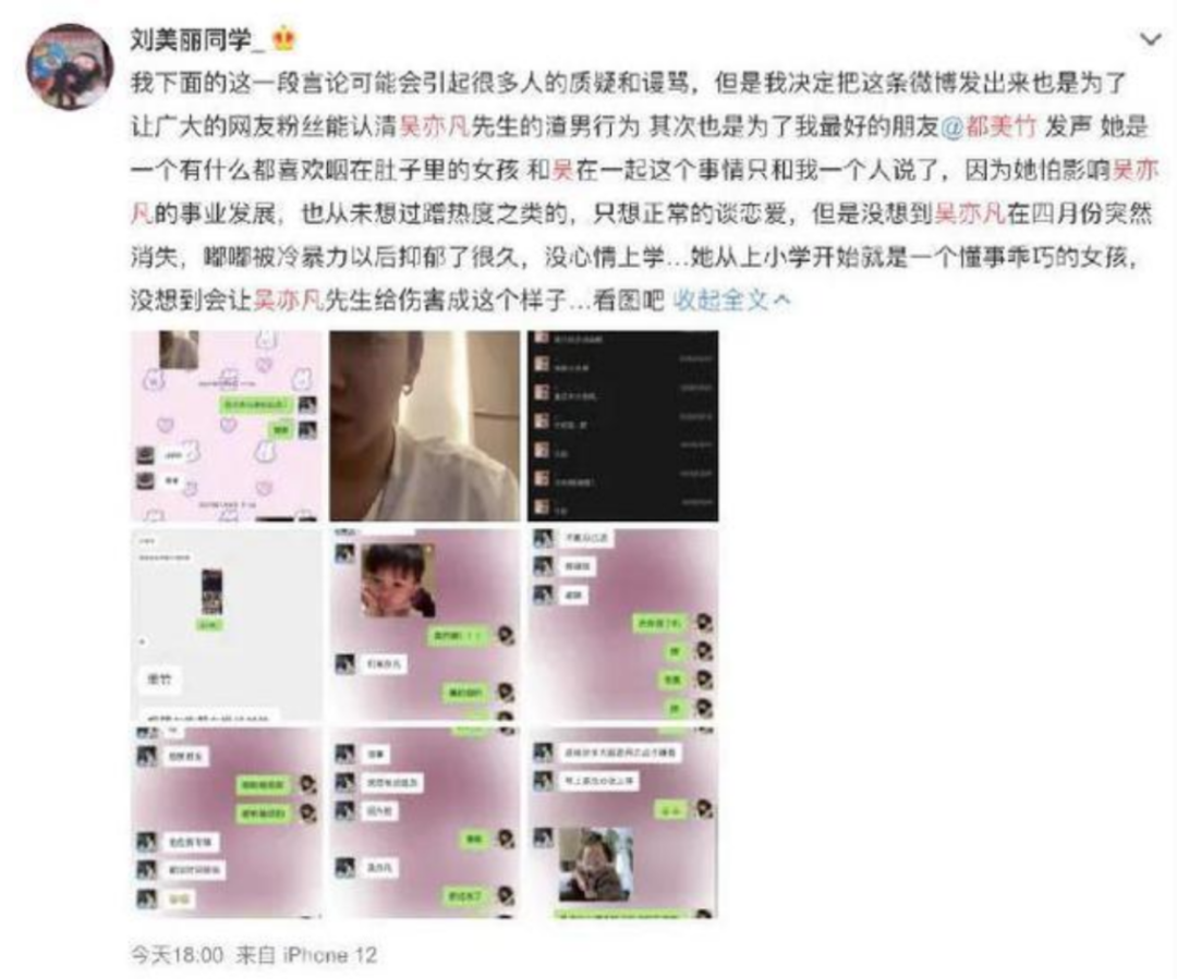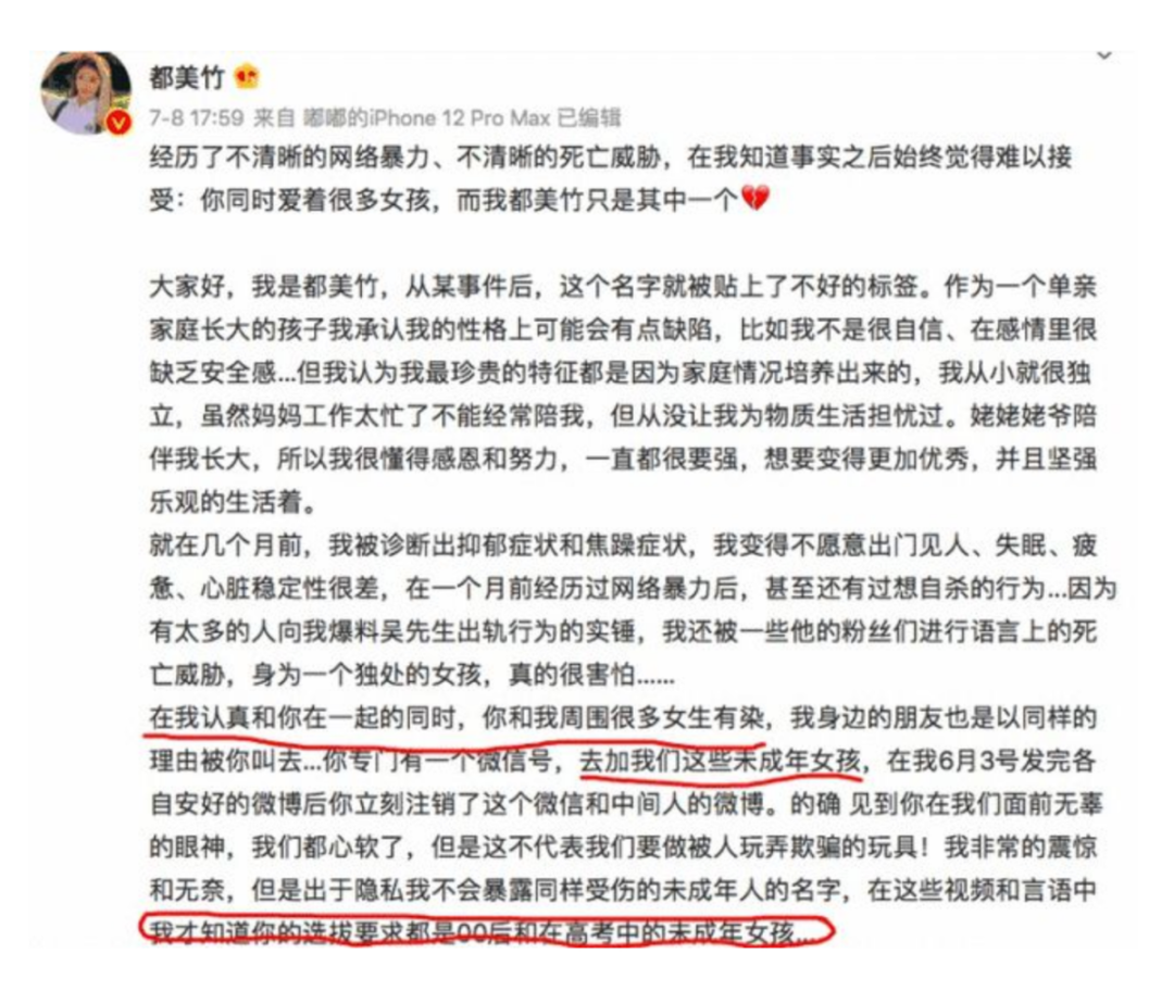 2021年6月,都美竹的闺蜜在网络上爆料说,都美竹被吴亦凡冷暴力分手,导致患上抑郁症,无法继续学业。
