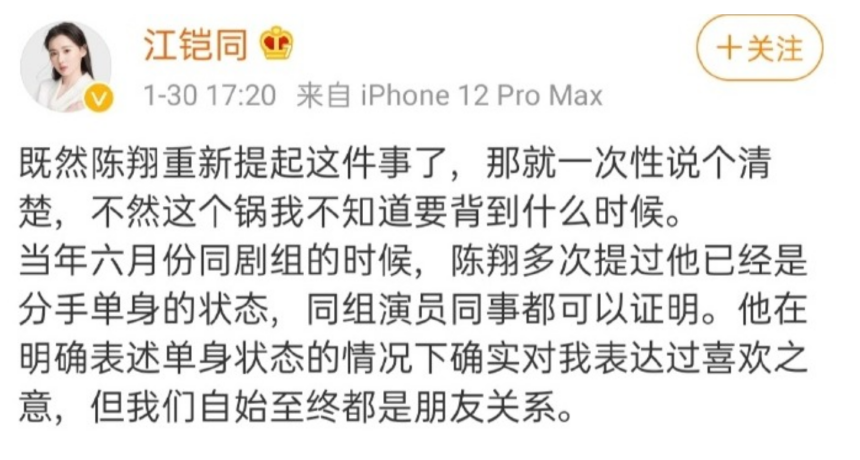紧接着,当年的“小三”江铠同也发文说“这个锅我不知道要背到什么时候”。