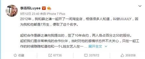 薛之谦后来发长文,对李雨桐的爆料进行了否认,还指责女方是借自己的名气开店,自己没有欠她的钱;女方曾为自己打过胎,还在交往期间出过轨;自己曾受到女方家人的威胁等等。