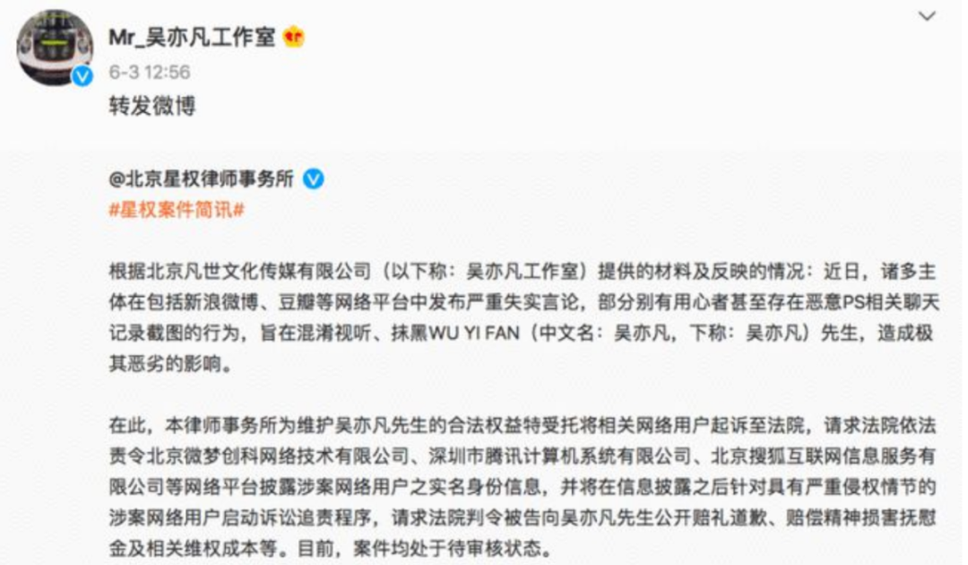 紧接着,吴亦凡工作室发布律师函,声称起诉造谣者。按照惯例,到这里开始危机公关,风波一般就会慢慢平息下去了。