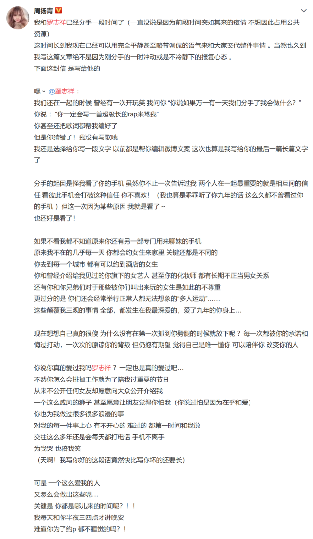 2020年4月,为了不在疫情最严重时期占用公共资源,经过几个月的冷静期,周扬青给罗志祥写下这封长信。