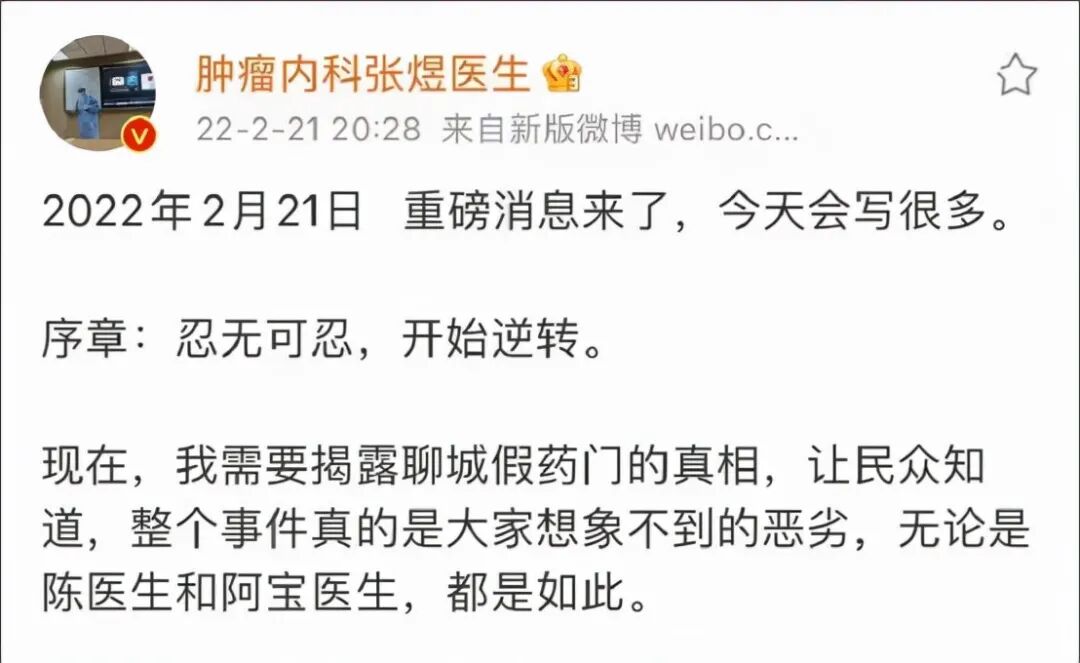 2月21日,张煜突然一改口风,连着发了五篇微博表示要揭露“聊城假药案”的真相。