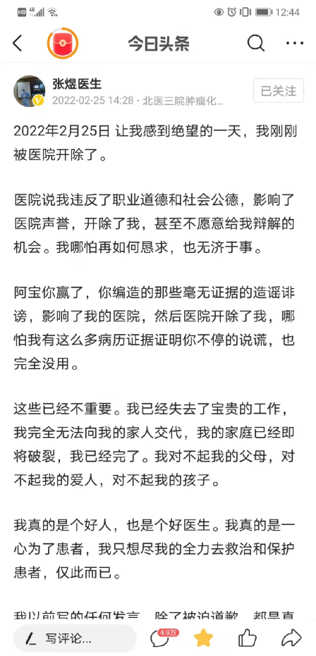 2022年2月25日,处在风暴中心的张煜突然发文,称自己很绝望,并晒出一张北京大学第三医院开除他的通知书。