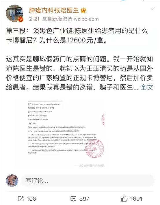 2022年2月14日,张煜在一个社交平台,回答了网友“如何看待聊城市肿瘤医院医生向患者推荐抗癌药卡博替尼,因认定为假药遭患者家属投诉”的问题。