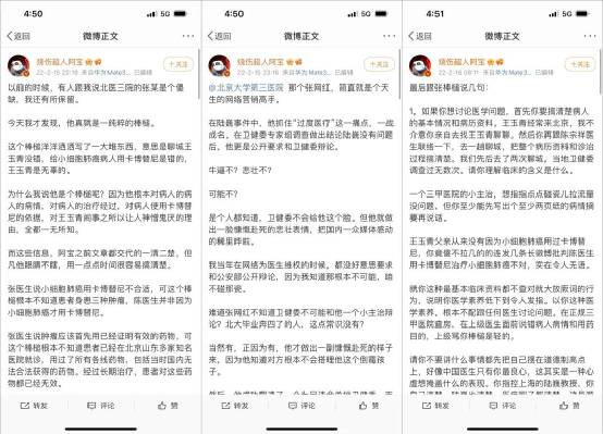 在第二条微博里,张煜拿出患者的病历和文献原文作为有力证据,推翻阿宝前面的说法,。
