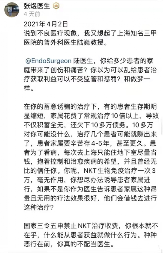 2021年4月2日,张煜医生在知乎发文,实名揭露上海某医院医生陆巍,给患者治疗时“蓄意诱骗”,家属花光积蓄,还欠下10多万债务,最后人财两空。