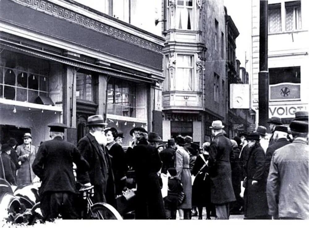 1938年11月9日,纳粹分子涌入犹太教堂、商店、百货公司打砸纵火,数十名犹太人因此丧生,数万犹太人被关进了集中营。