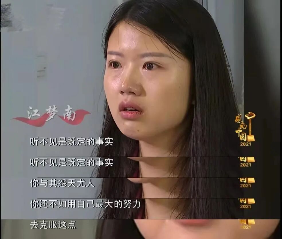 虽然对于自己的听力障碍,江梦南也曾感到难过,甚至是不甘。但是她明白,与其怨天尤人,还不如用自己最大的努力去克服这点。
