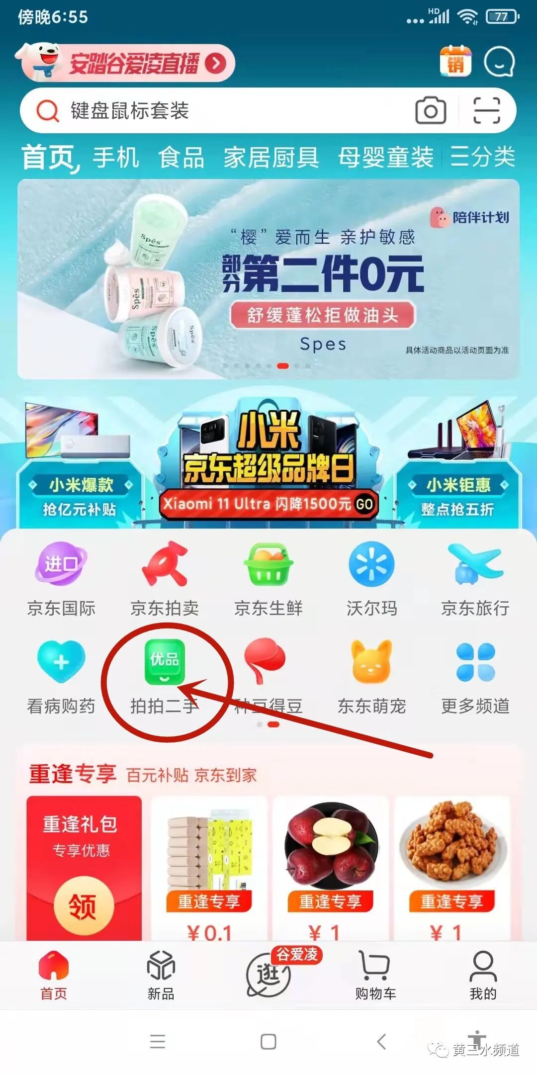 下载京东app,在主页就可以看到,拍拍二手,这是京东平台上的一个二手交易频道,我们可以从这里搬运。