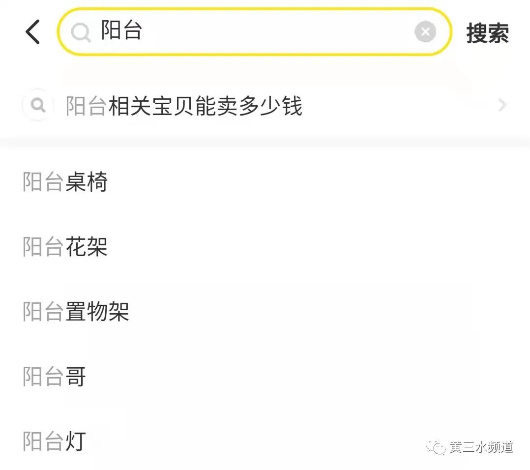 举个例子,比如我随手打了个词“阳台”,会出现下拉框,排在第一的下拉框词,搜索量都是比较大的,我们可以点这个词进去。