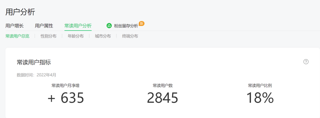我看了下公众号后台,4月份的常读用户增加了635,常读用户总数2845,占比18%