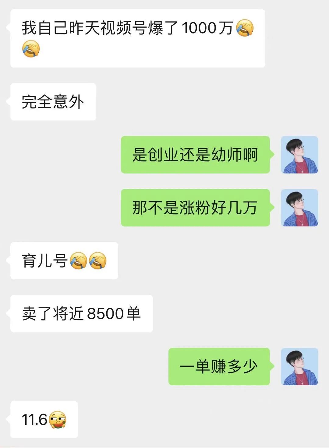 昨天朋友跟我说,他们做的育儿类视频号,一条视频爆了1000万播放量,出单8500件,一件赚10多块,相当于一条视频赚了快10万。
