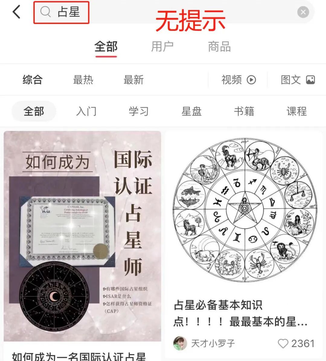还有些是转型做星座或占星的,因为占星这个词在小红书和B站还是宽松的,但是搜塔罗,都会给一个防迷信提示。