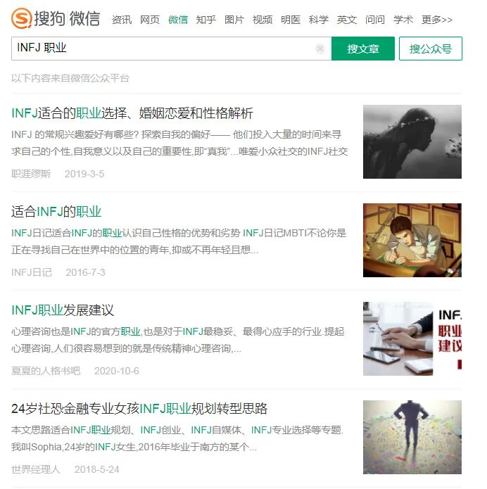 3、微信搜狗:你的人格类型 职业,查看相关文章。比如搜索:INFJ 职业