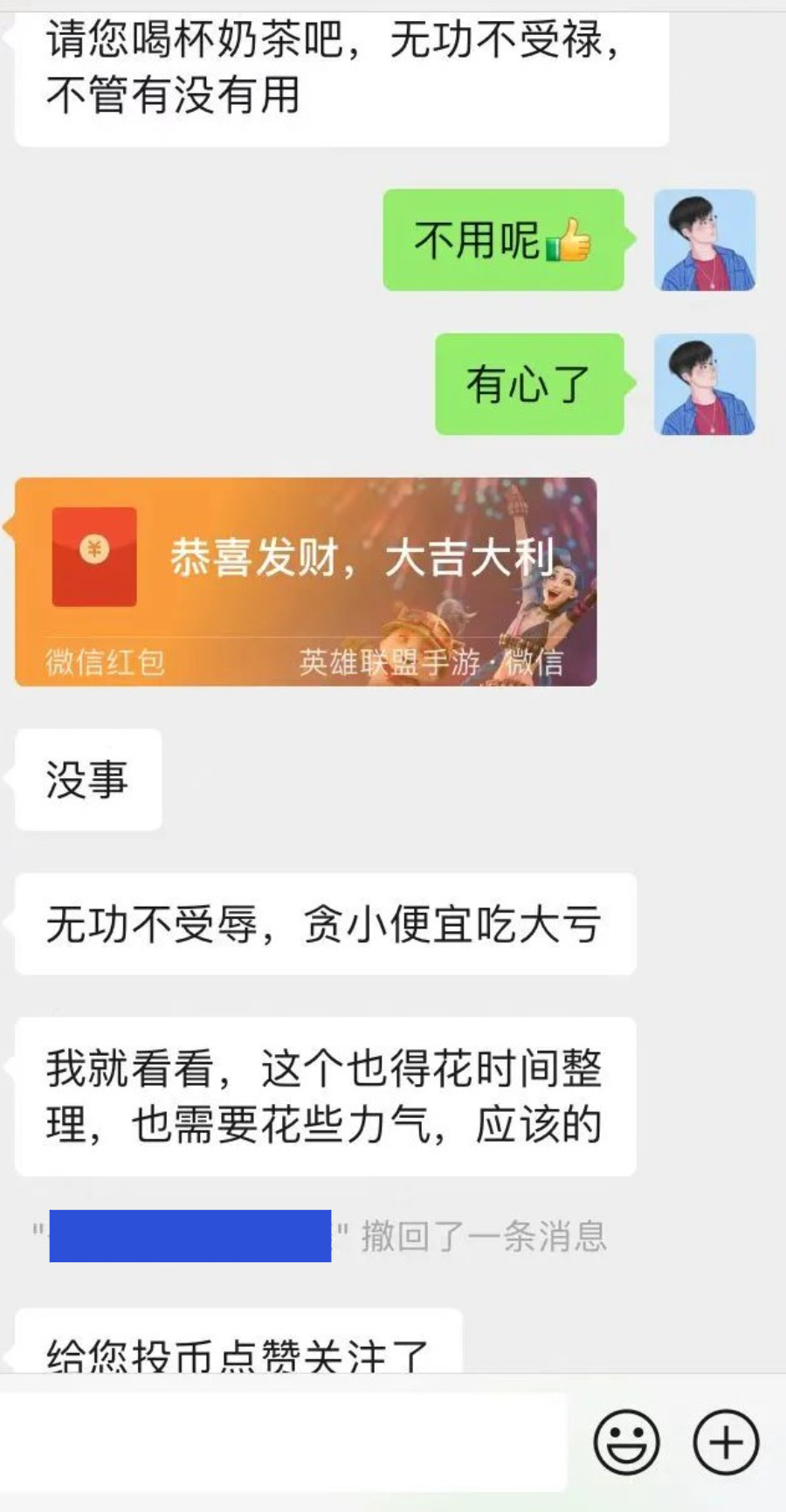 这是我第一次见到有人领资料发红包的,印象很深刻。我说心意领了,跟他聊了一些。