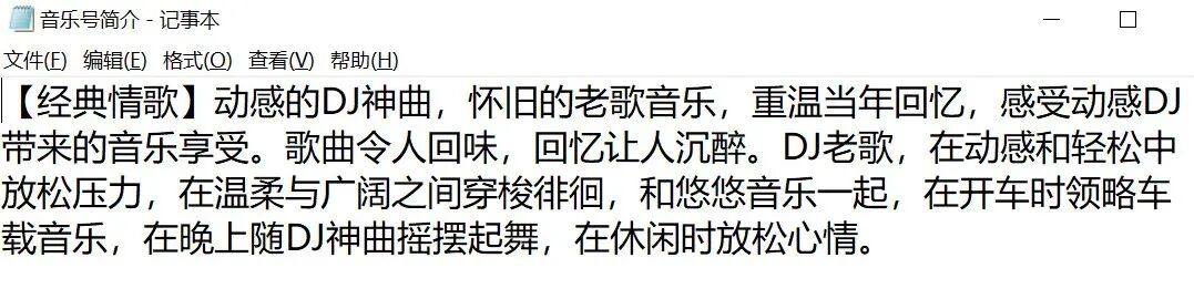 根据你要做的音乐类型来确定关键词,最后将这些关键词,加一些话语,连在一起。比如:分享好听优美的经典老歌,感受愉悦轻松的车载音乐。