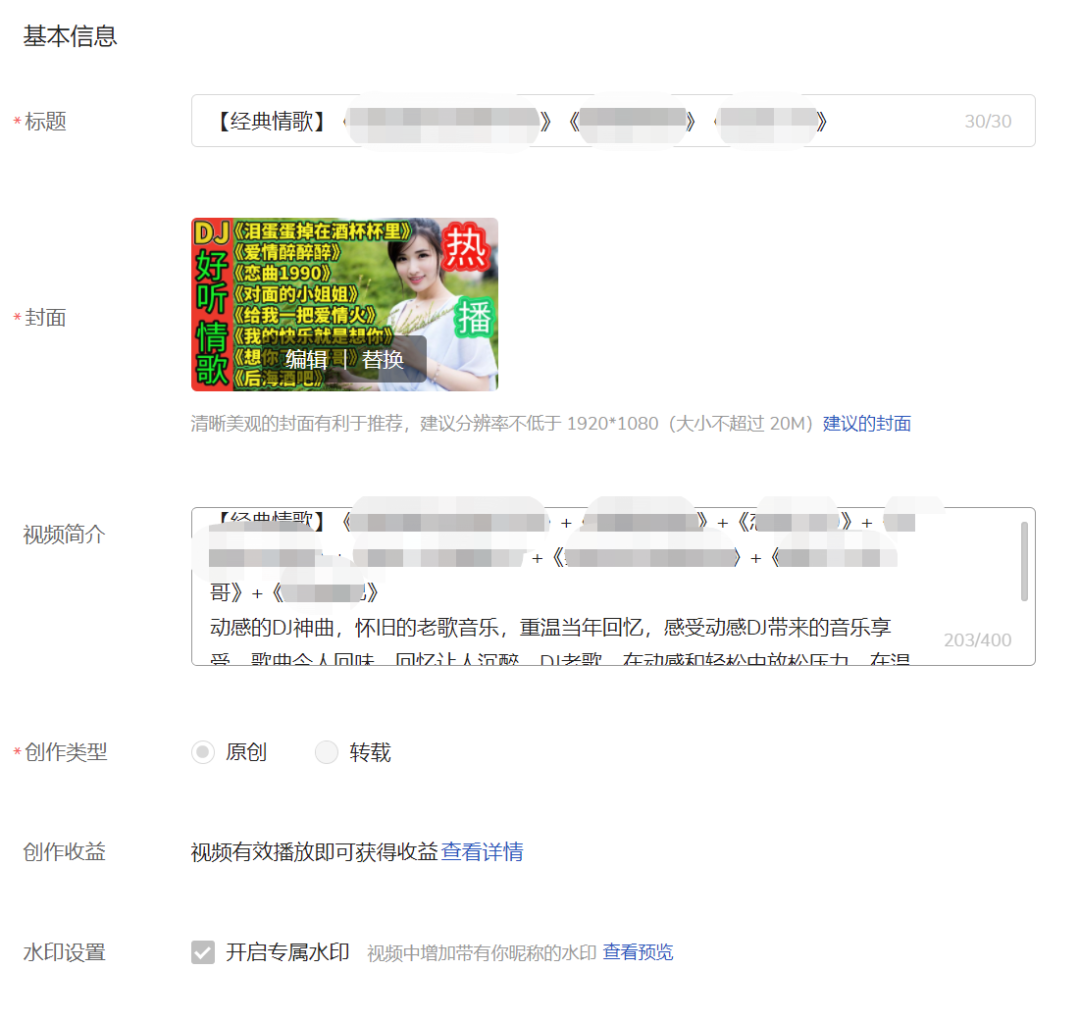 5个视频上传大约需要10多分钟,这10多分钟我就顺便制作封面+填写视频资料。
