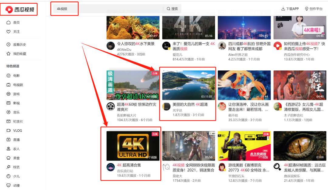 西瓜视频上搜4K视频、风景视频、开车第一视角、公园等关键词,可以找到很多视频素材。