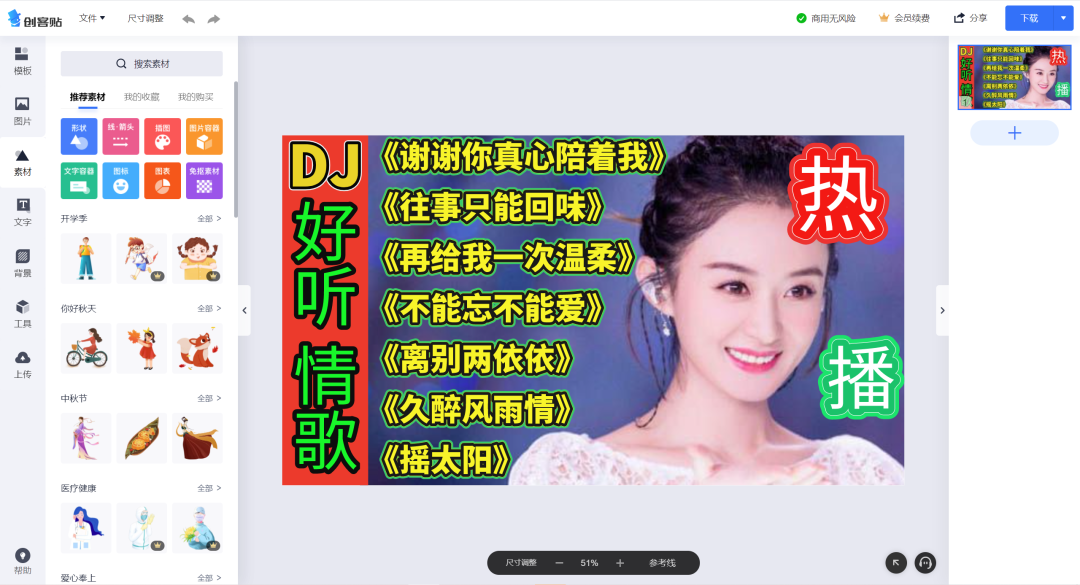 封面组成=头标+歌单+背景图,另外也可以加“热”“播”两个字,增加火热的感觉。