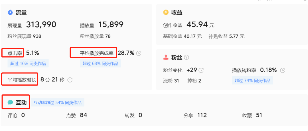 (2)另外还有几个关键的指标:完播率、平均播放时长、点击率、互动率。互动率就包含点赞、收藏、评论和转发这些因素。