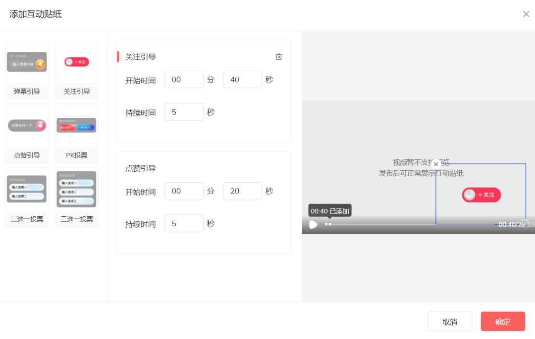 (7)点赞时间点:20秒,持续时间5秒;关注时间点:40秒,持续时间5秒。