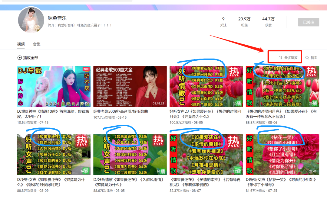这些视频一般是七八首歌,但我们不要全部收集,只记下前2首歌就行。