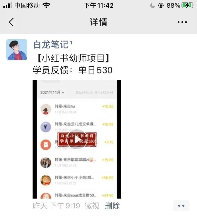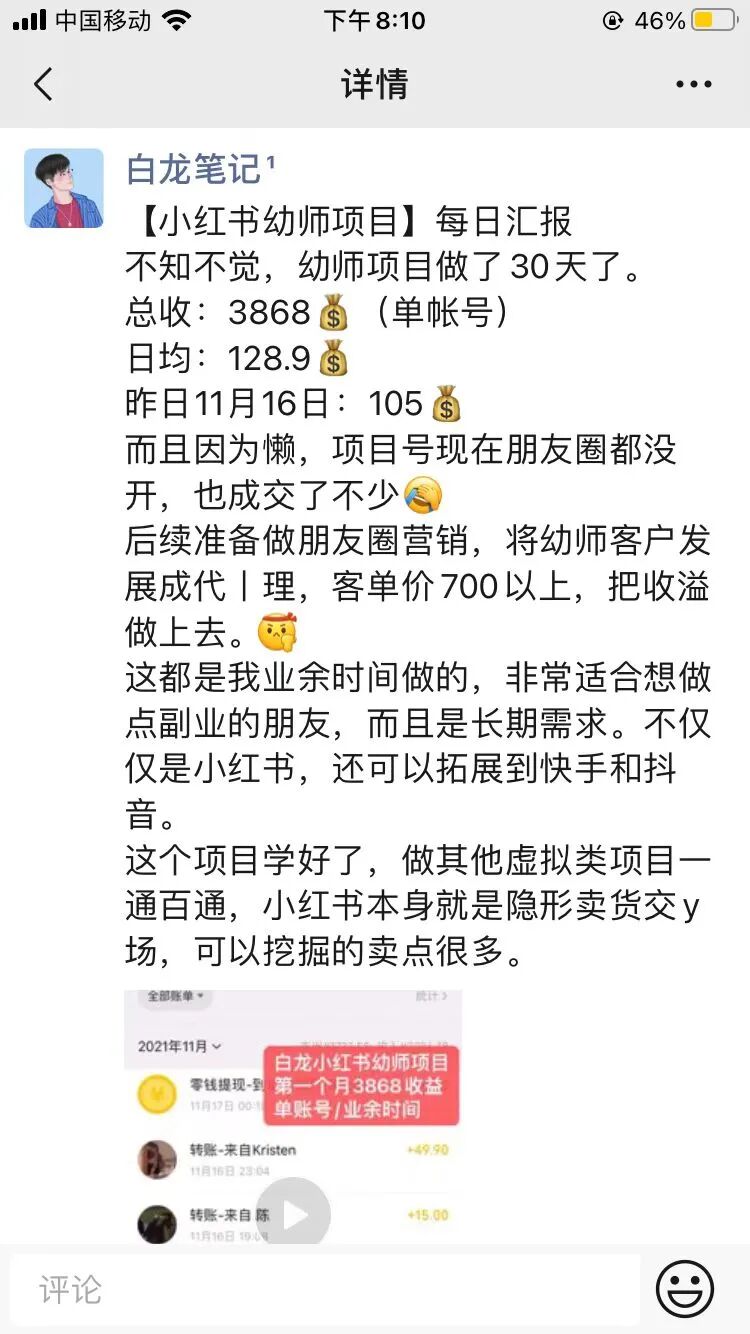 后来机缘巧合,学员小墨跟我说他最近做了小红书幼师项目,一个月赚了6000多,于是我开始研究小红书幼师项目。