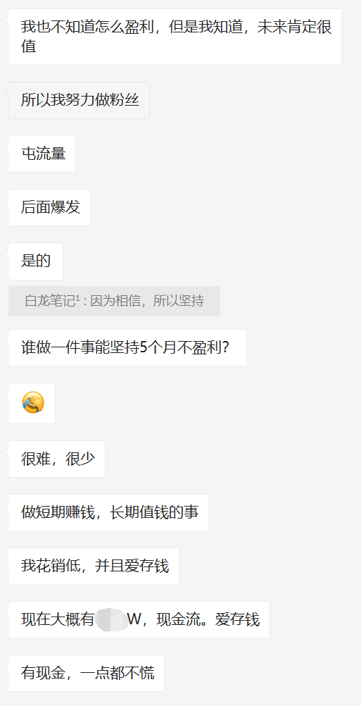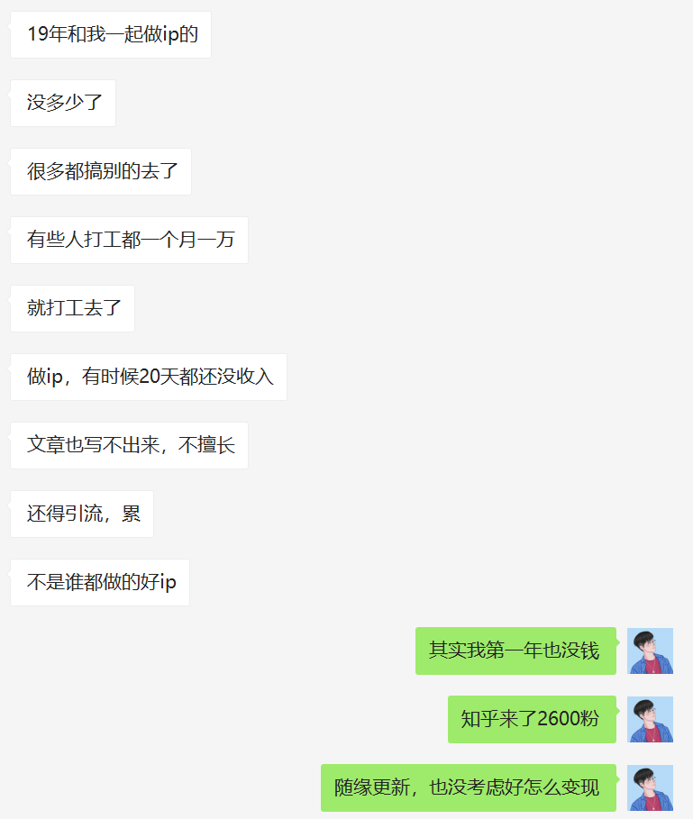 现在他公众号七八万粉,跟他同期一起做IP的,很多都放弃了,回去打工了。