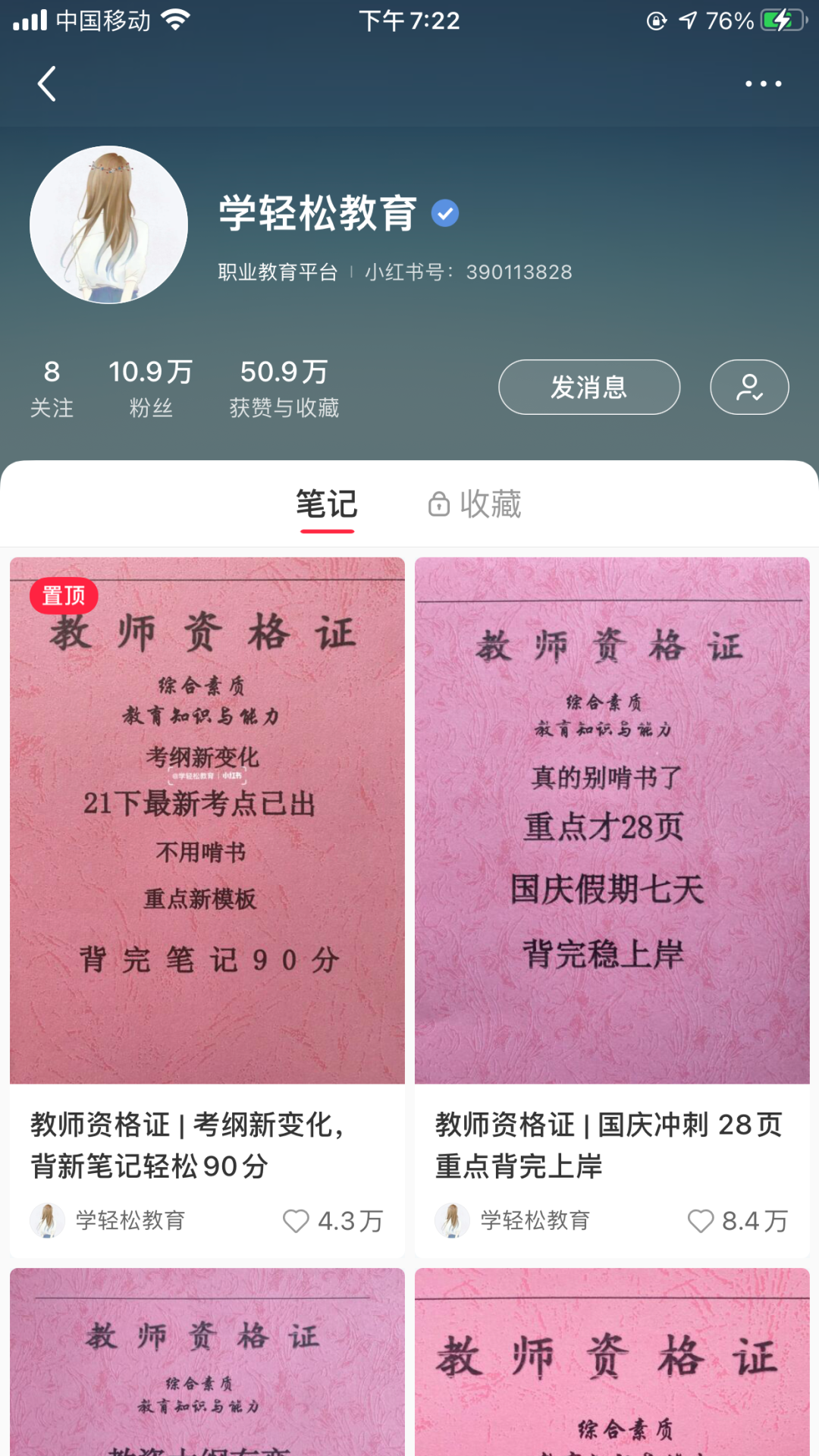 刚好就刷到一个做教师资格证的账号,11万粉丝,单篇点赞普通1000+,最高有8.4万赞。