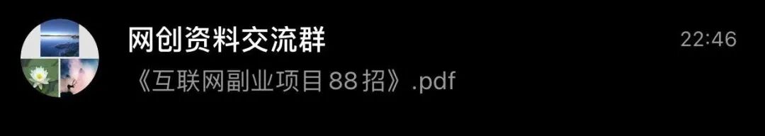 混进网盘群之后呢,他不是直接发广告,而是把自己写的副业类文章,或者网上收集的文章,打包成文章合集,做成PDF电子书,取名《XX副业88招》、《XX创业108计》,然后发到网盘群里面。