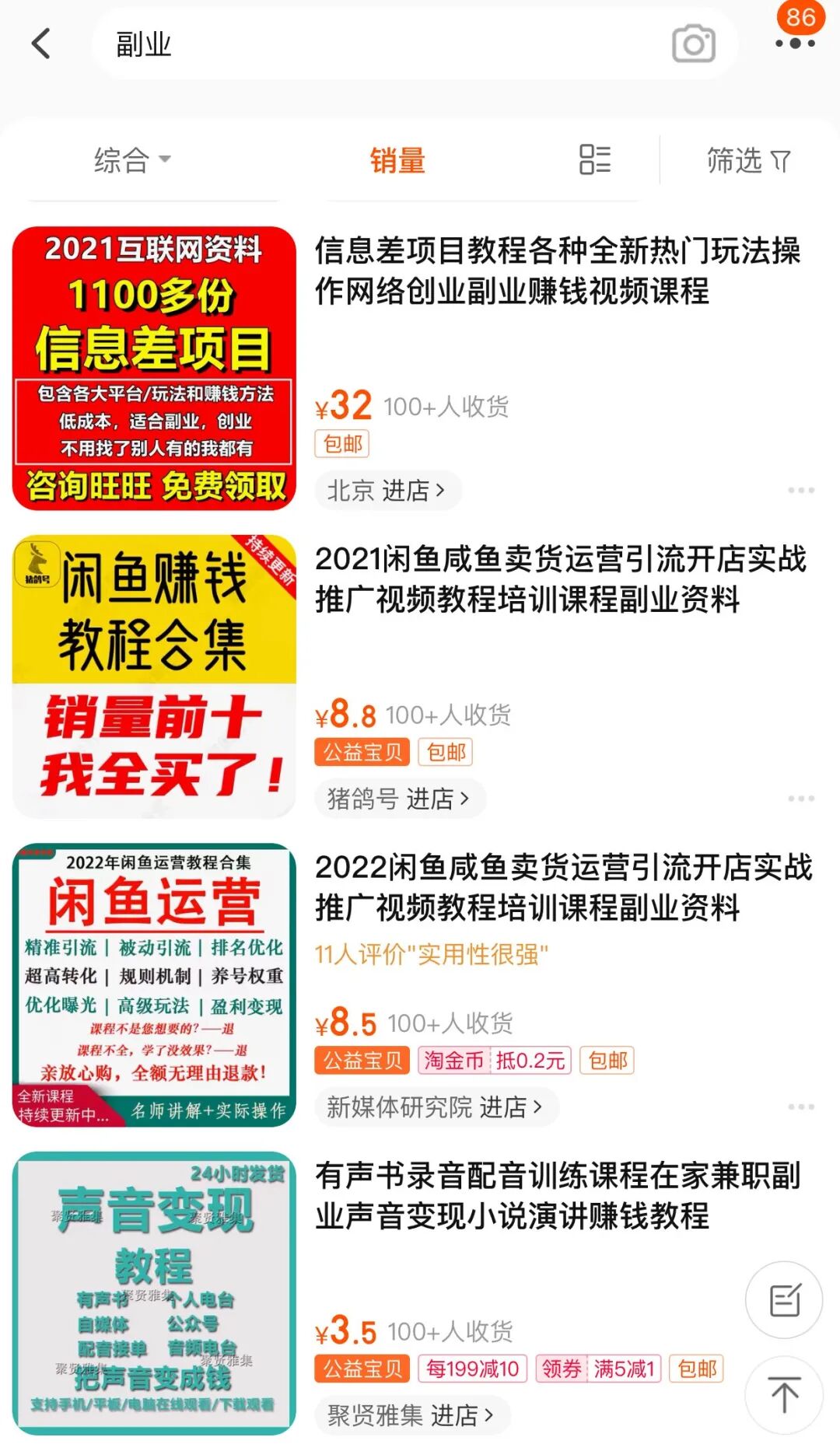 他也是做副业类公众号的,他在淘宝上搜:项目、副业、创业、抖音、自媒体、赚钱、副业教程.....,就会找到很多几块钱的资料。
