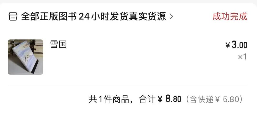 川端康成的《雪国》,书3块钱,邮费5块8,总共8.8元。