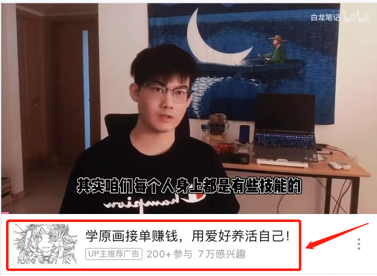 广告分成,就是B站在你的视频下面会插入一个横条广告,一个观众点击了广告,则给你对应的点击收益。