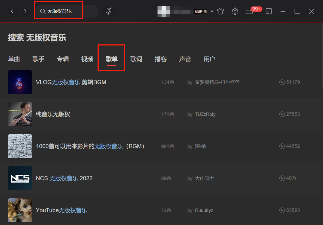 我们可以在网易云音乐上搜“无版权音乐”,在“歌单”类目下有很多歌曲。
