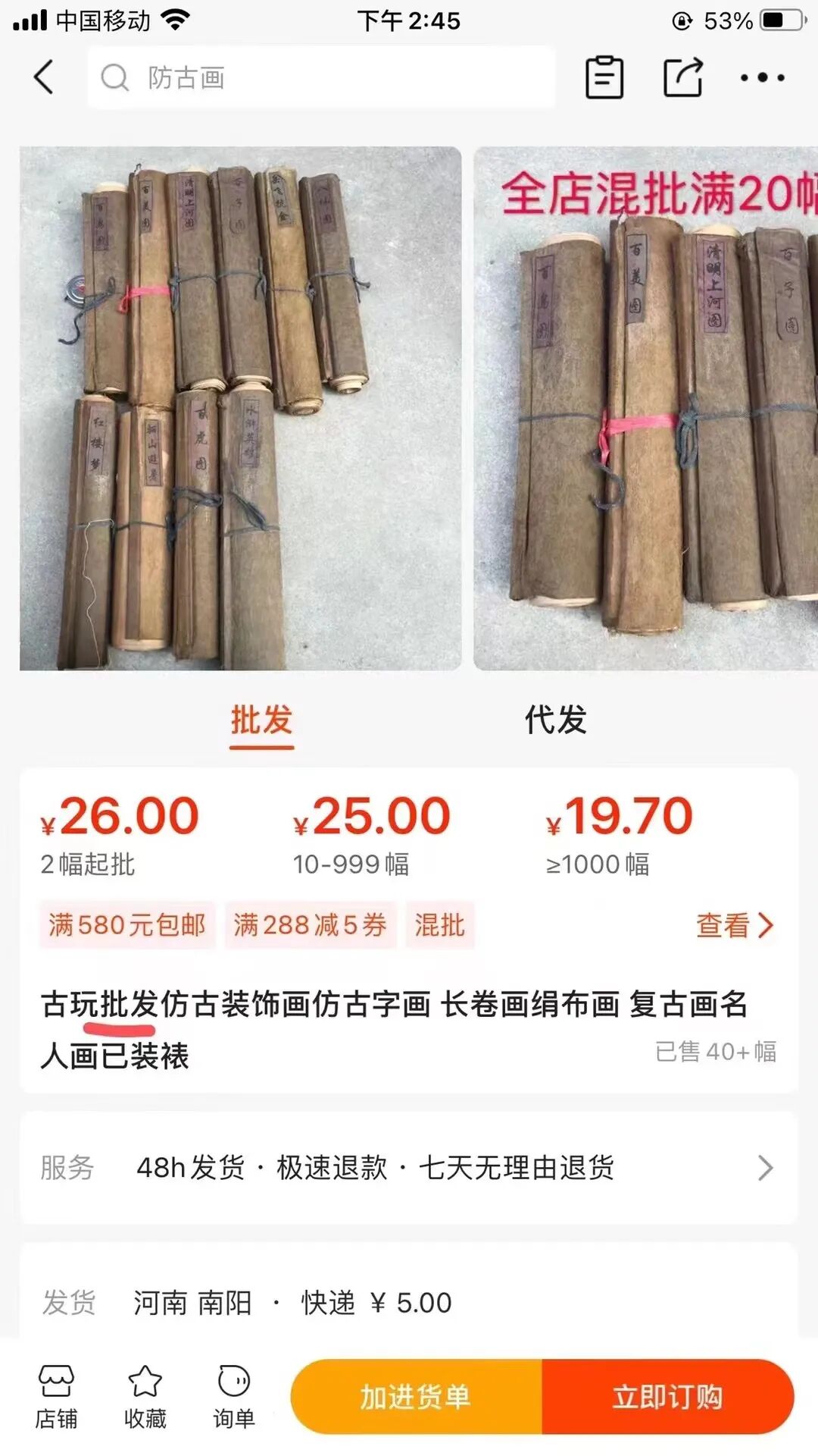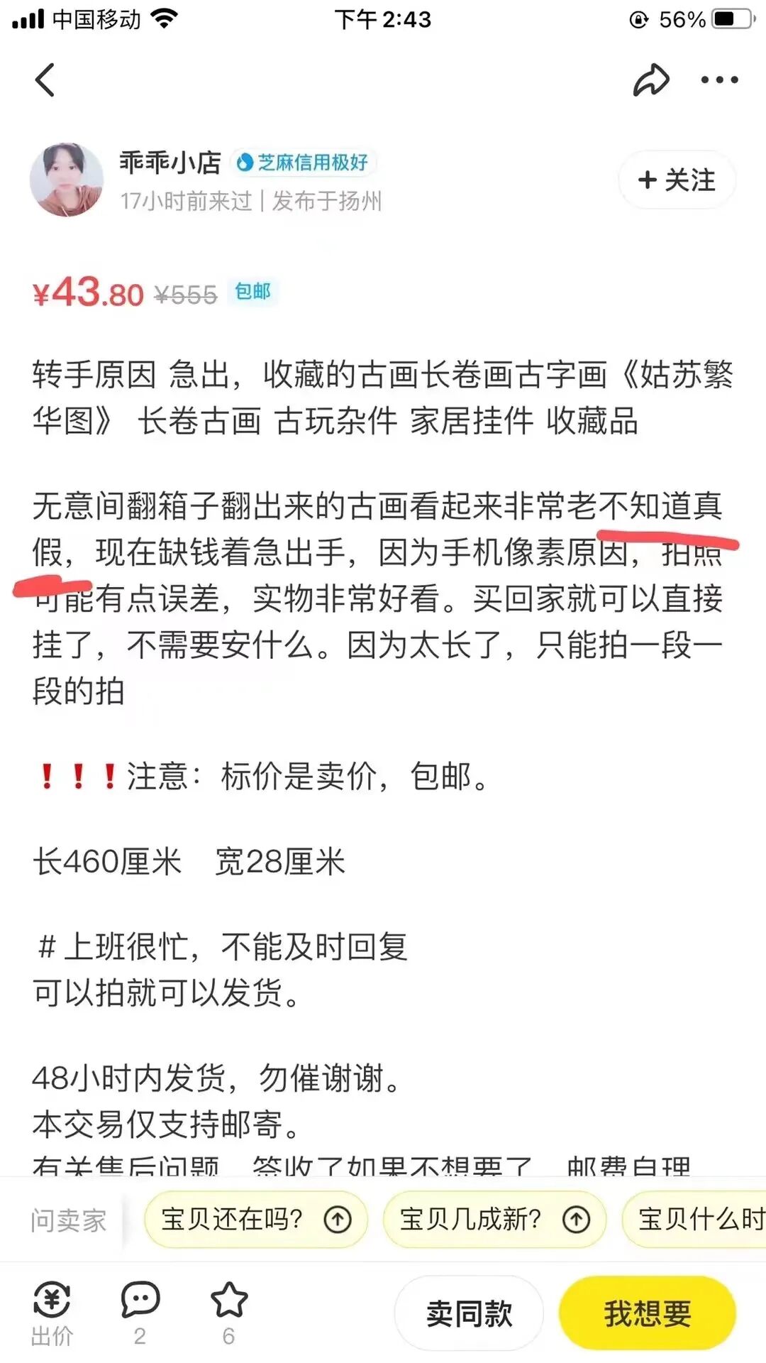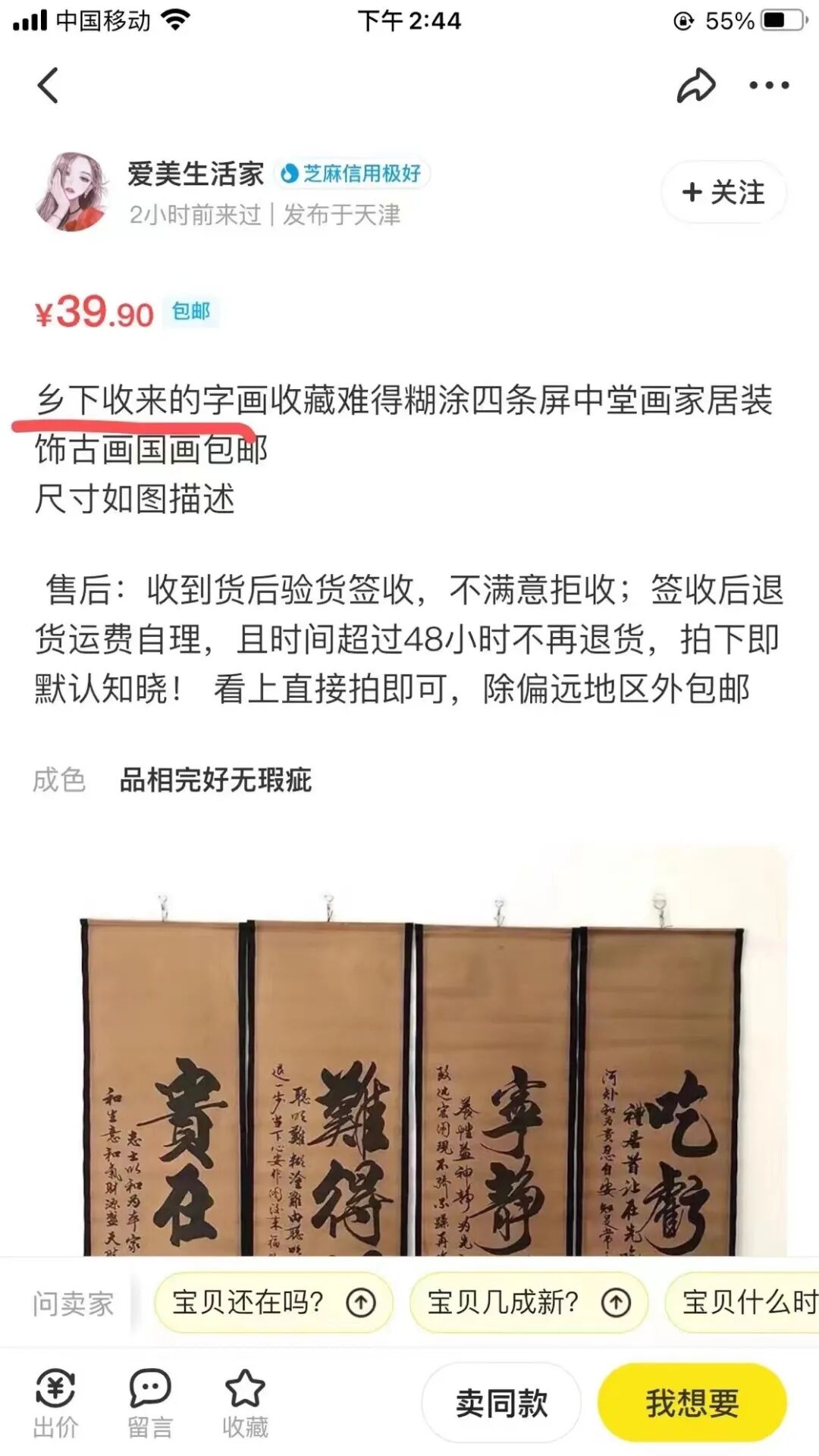 闲鱼上发帖:乡下收来的古字画,不知道真假,50一副。