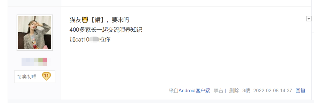 每当有人发帖了,他就回帖:猫猫交流群,加XXXX拉你~