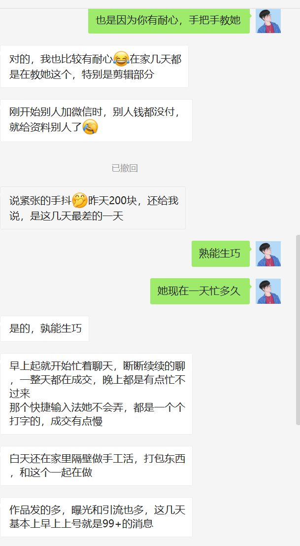 这件事真的让我大开眼界,他的妈妈,应该也不知道什么营销理论,也没看过什么网创教程,但就是找到了一个赚钱路子,猛怼执行力就行。