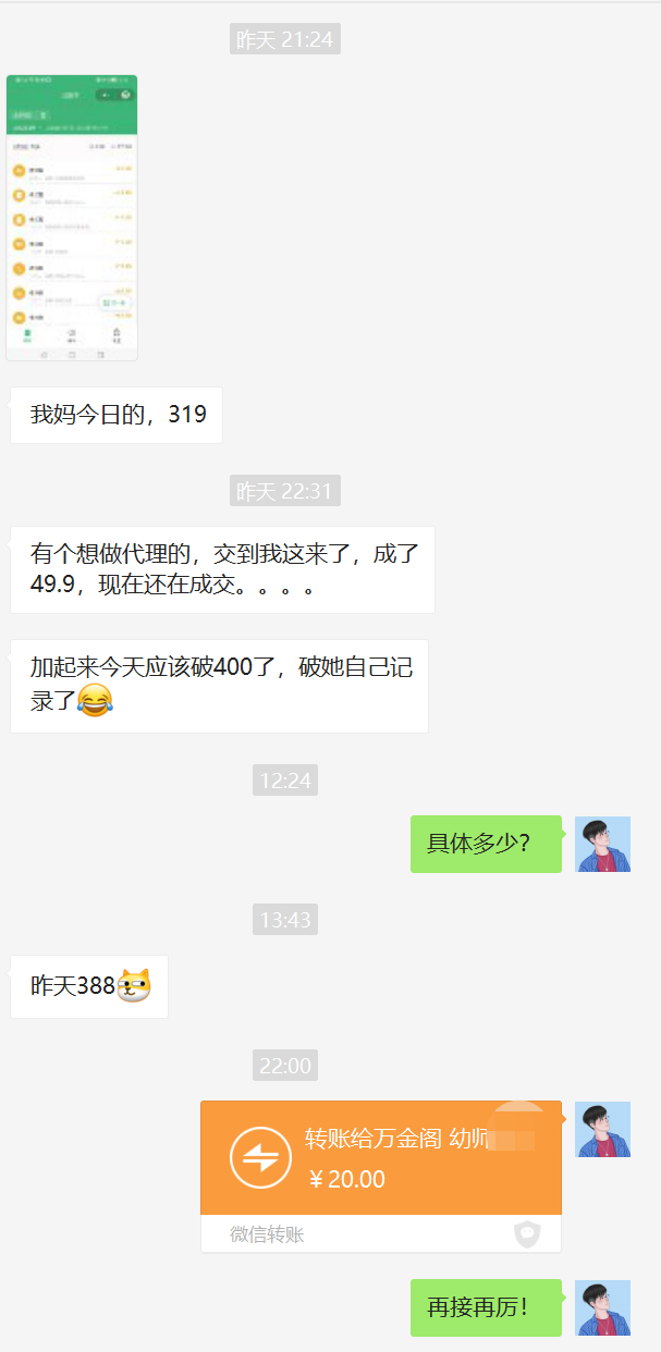 今天跟我反馈的,他的妈妈3月3日388元收益。