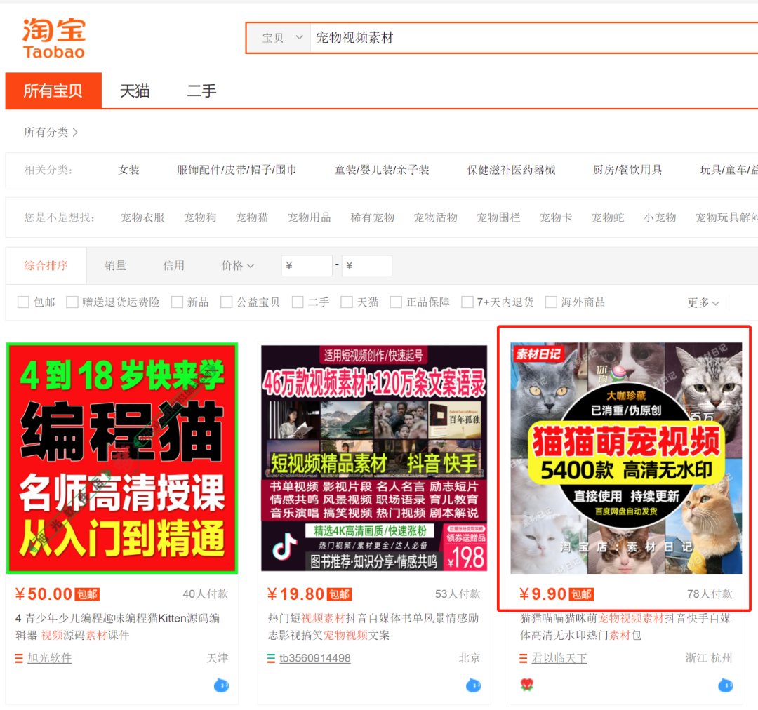 一是淘宝搜索:宠物视频素材